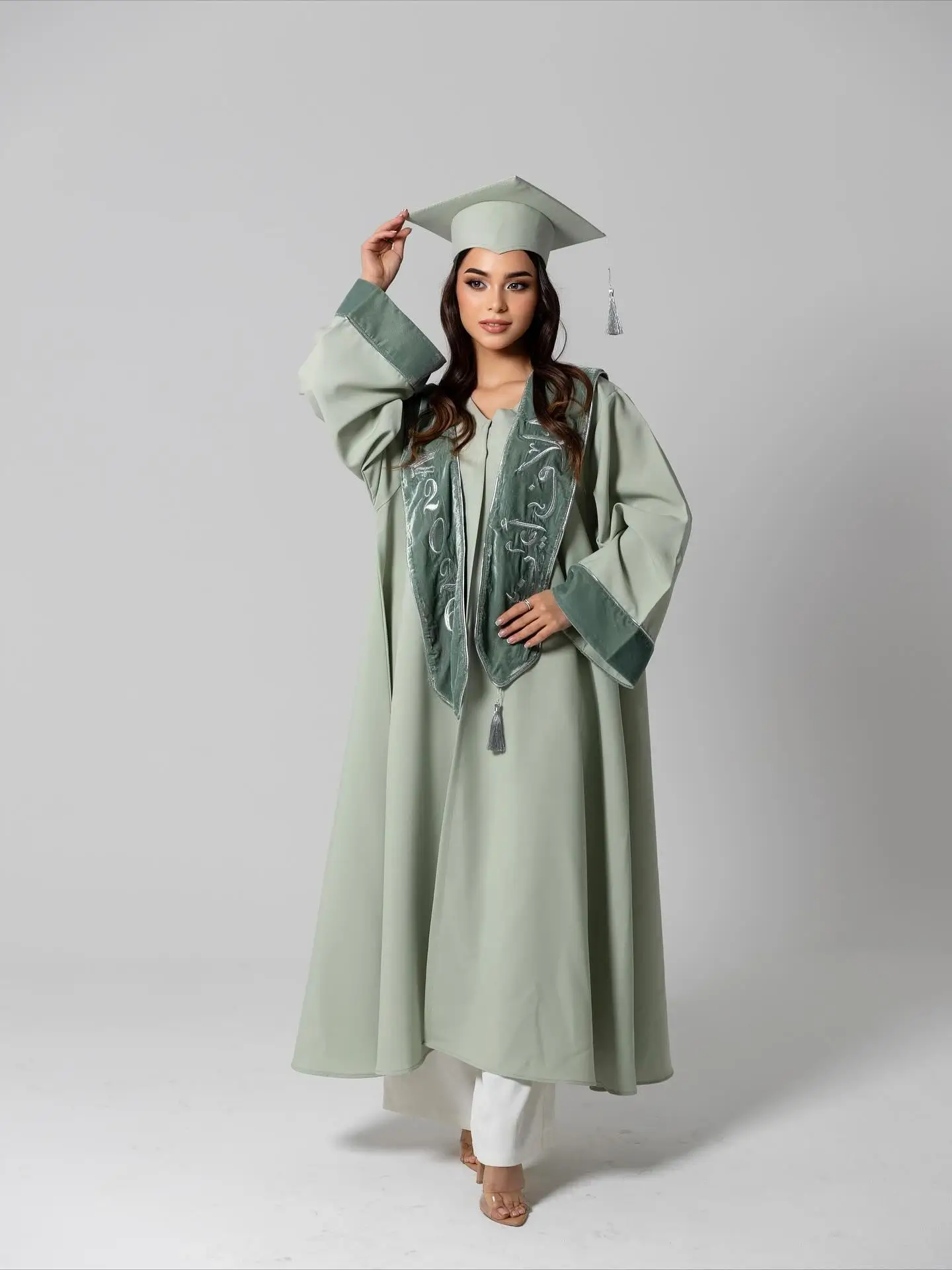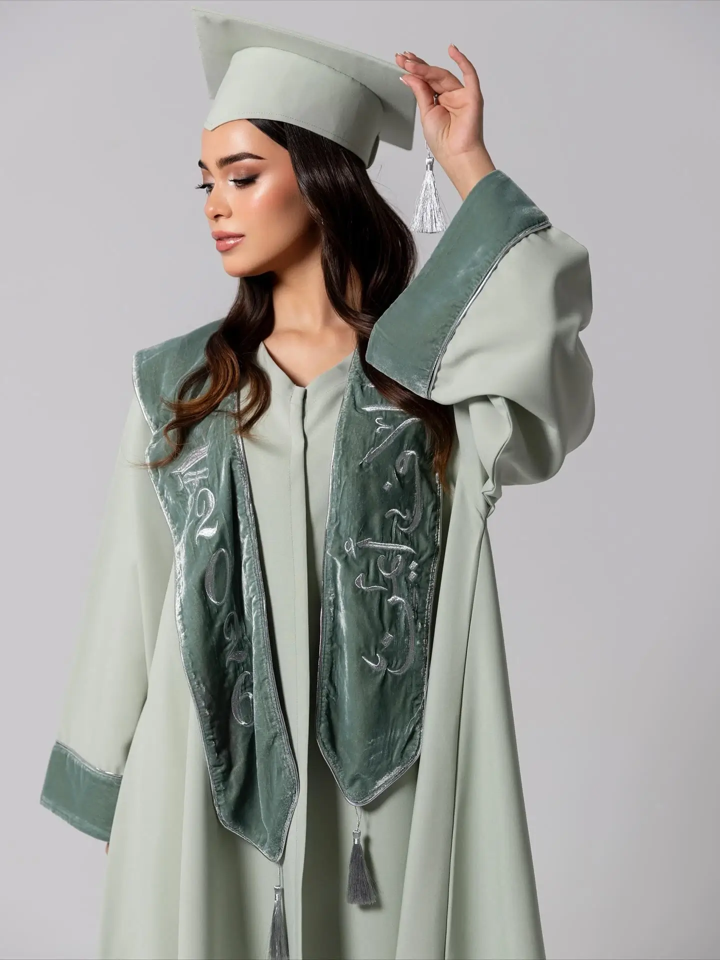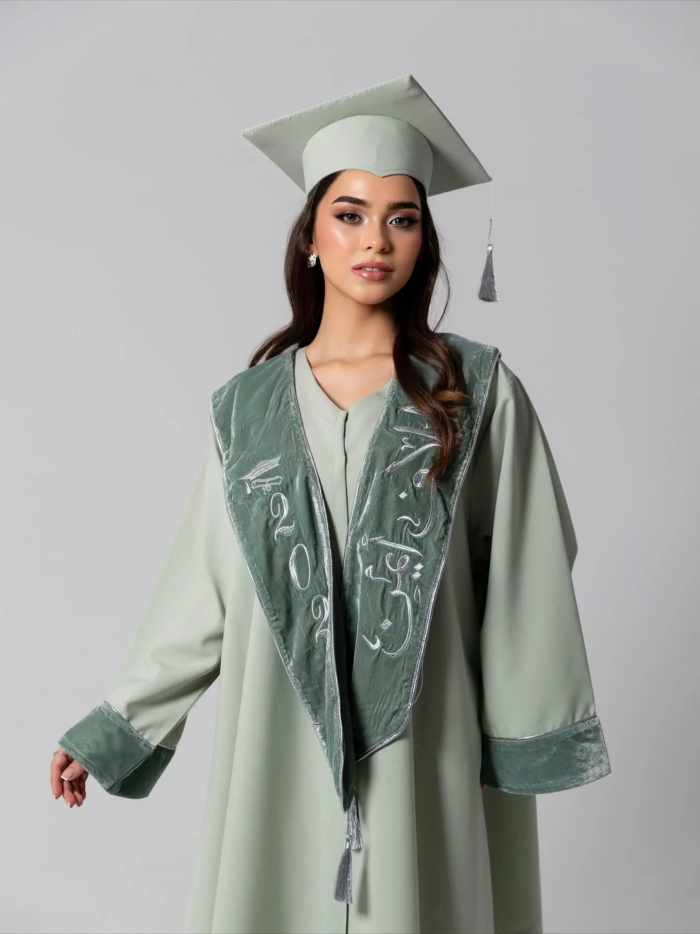التطريز: تطريز فضي لامع بدقة متناهية يشمل اسمكِ وسنة التخرج “2026” بخط عربي انسيابي.