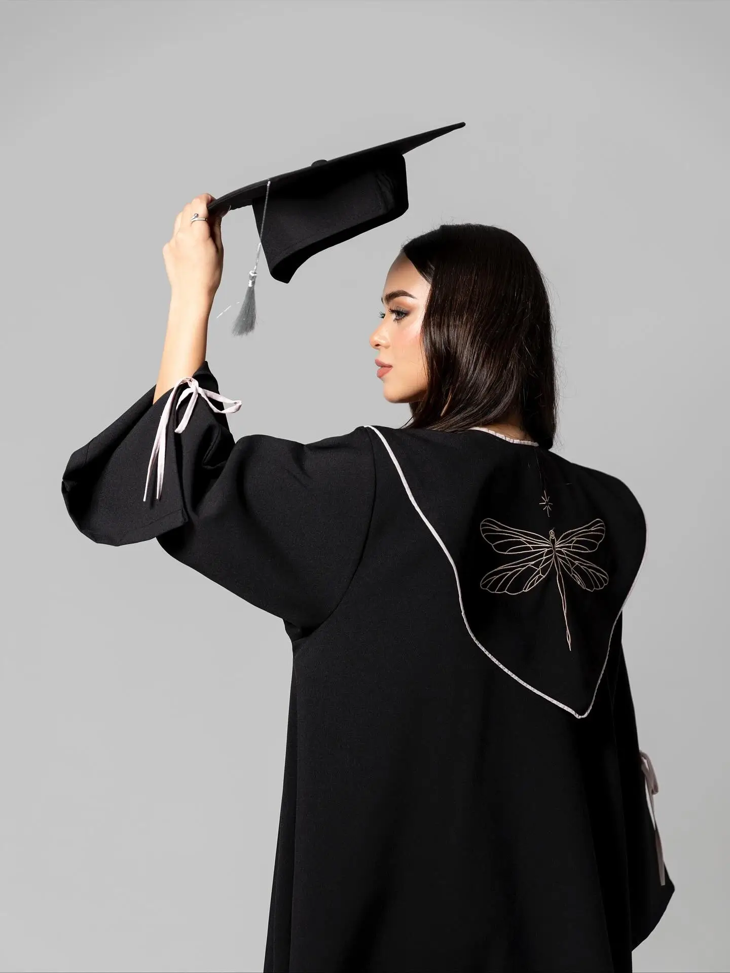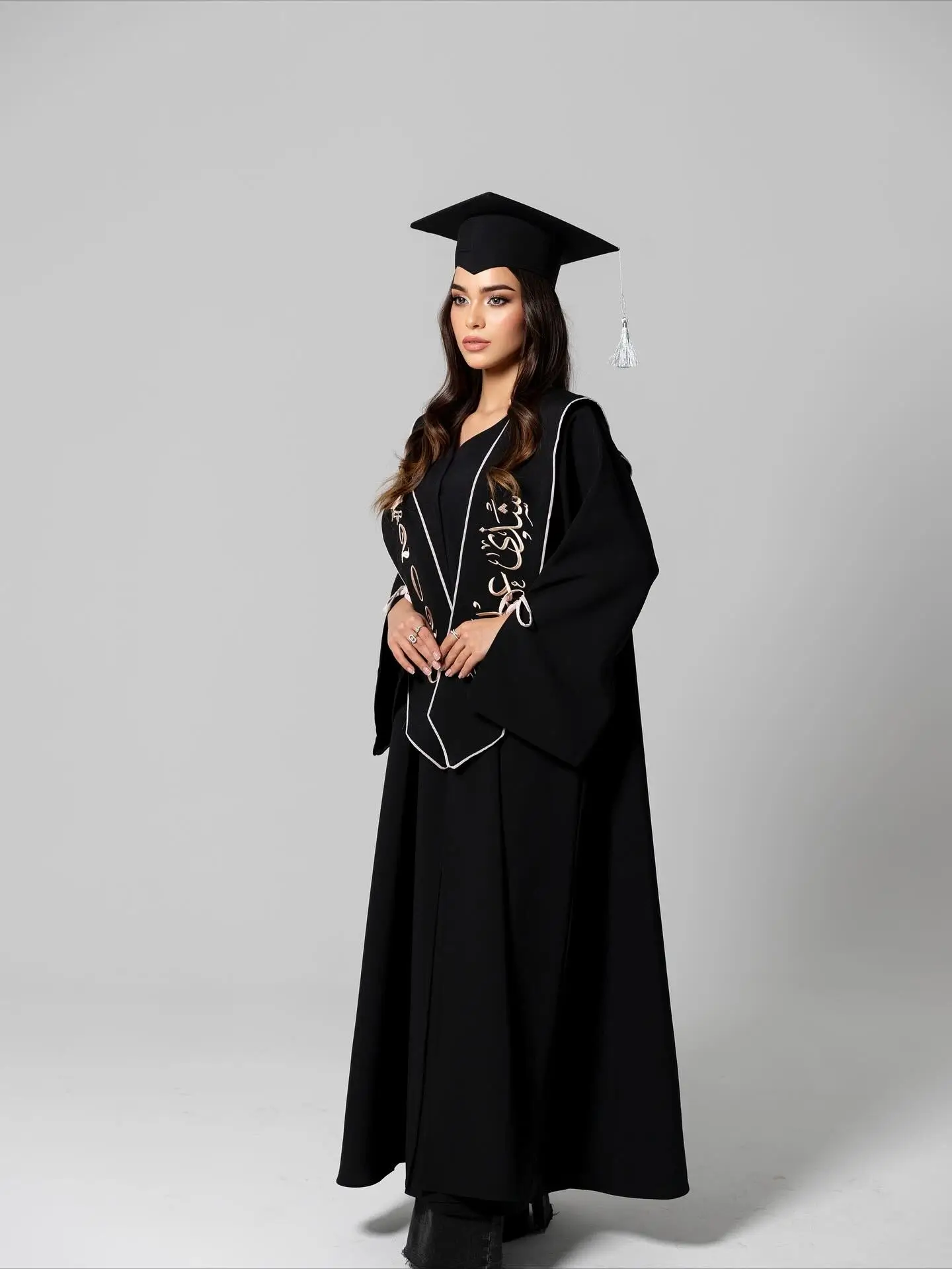 القبعة: تأتي بنفس لون العباية مع إمكانية إضافة تطريز مخصص (اسم أو سنة التخرج) بخط عربي أنيق.